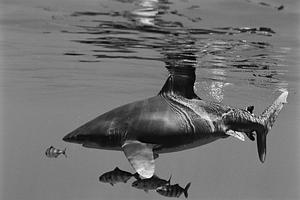This photo captures an Oceanic White-Tip shark during pregnancy. The image shows the subtle curve of the shark's belly, highlighting this rarely observed aspect of their life cycle. The simplicity of the scene invites contemplation about the role these creatures play in the marine ecosystem. The migratory patterns of pregnant Oceanic White Tip sharks contribute to the dispersion of their species and the broader ecological health of the oceans.