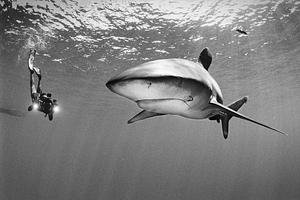 My friend Morri taking a dive to photograph a curious oceanic.
